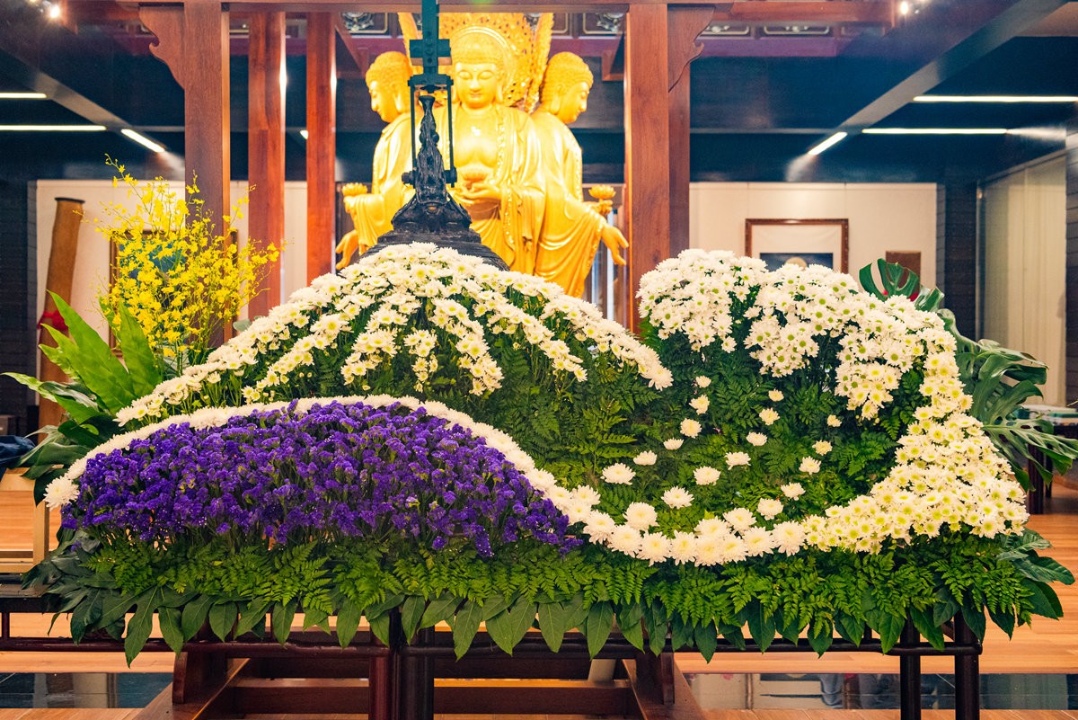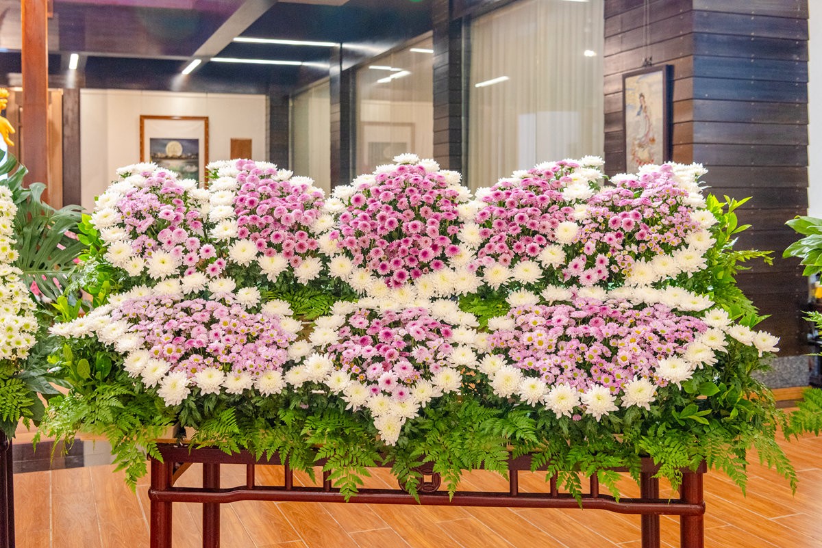 结业之际,众人以新学技艺创作出庄重大气、绚烂灵动的花艺佳作,并虔诚供奉于佛前。