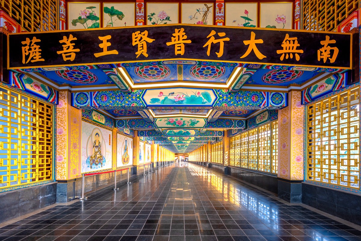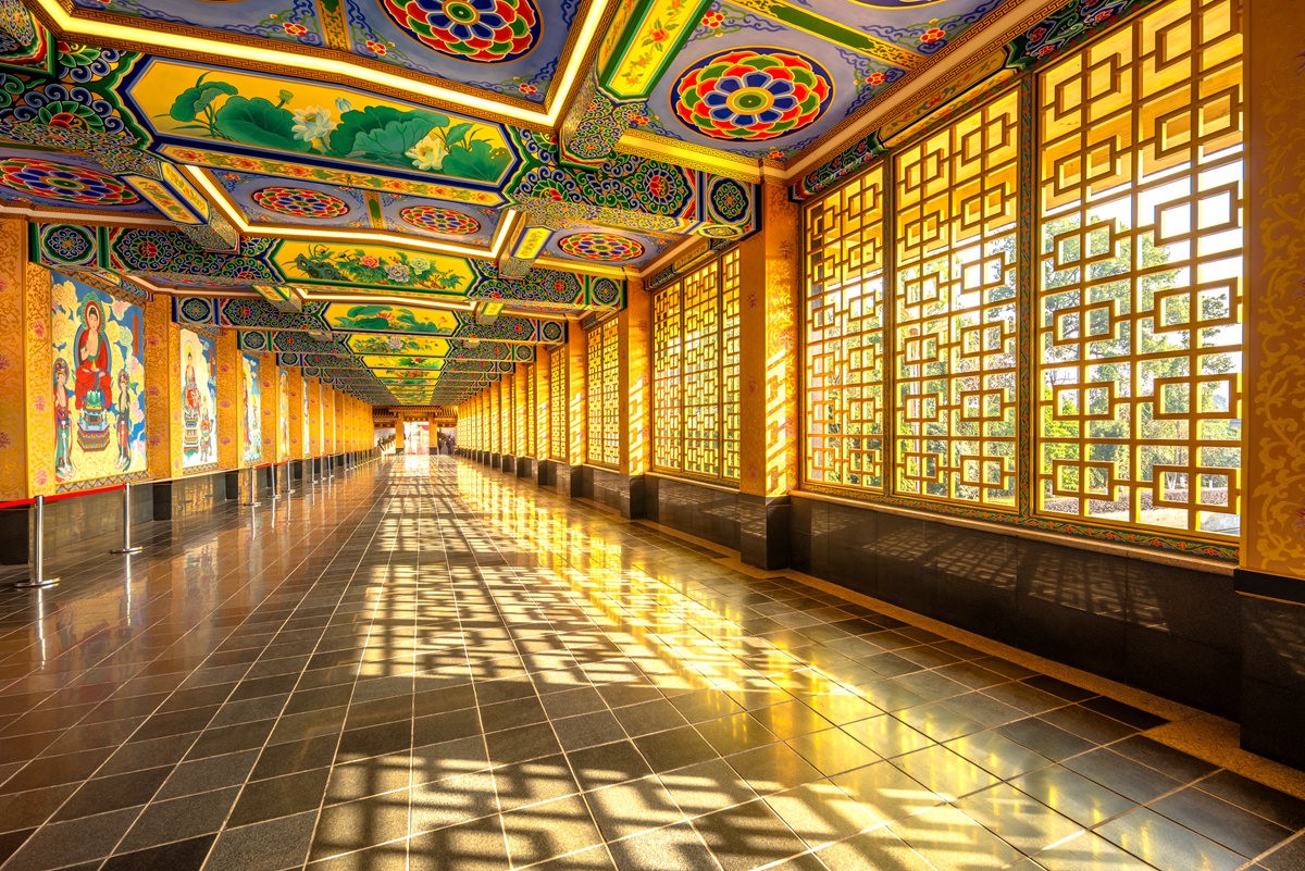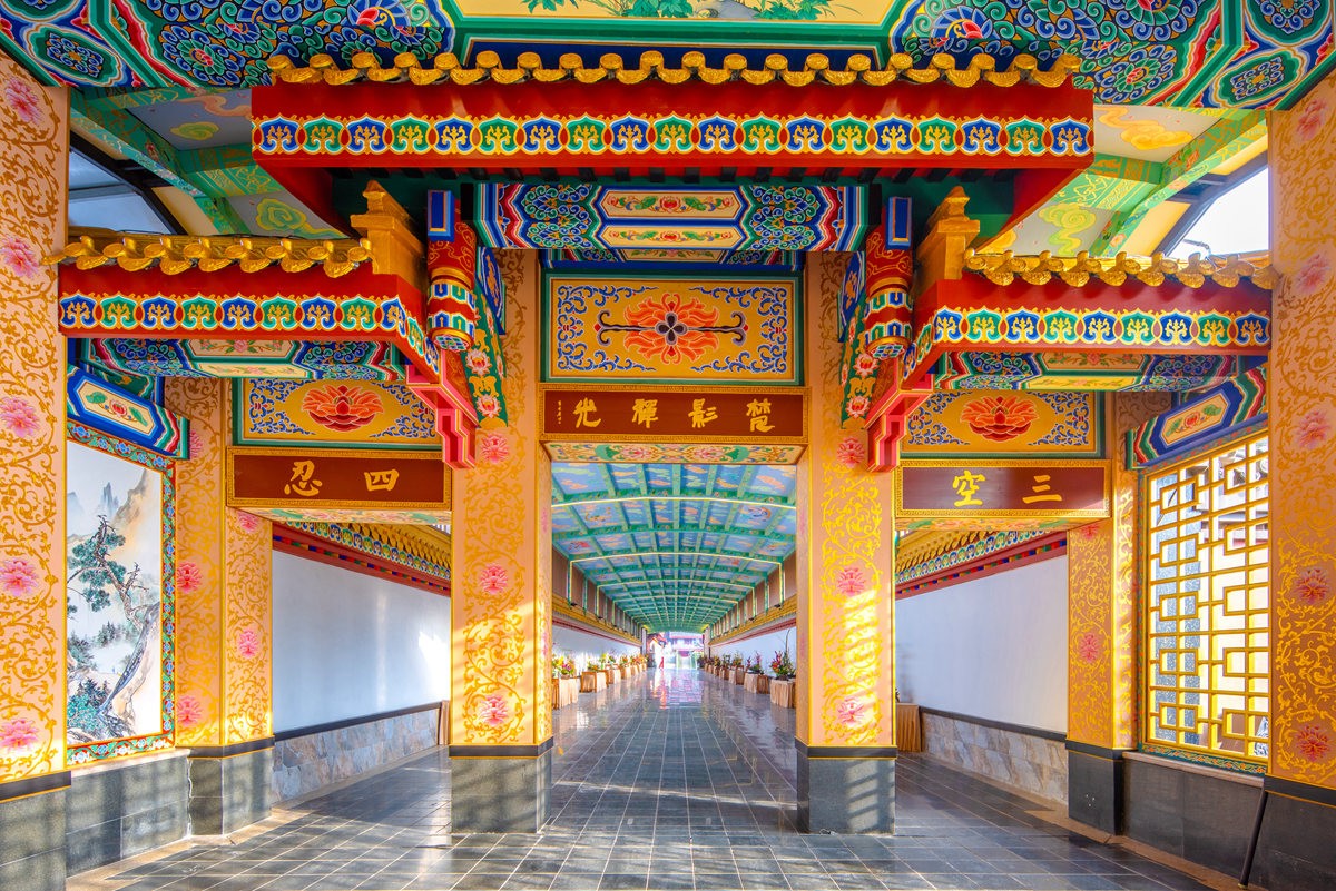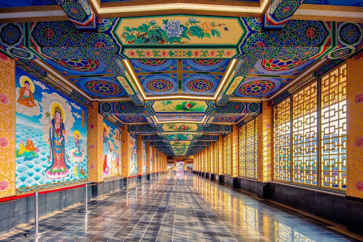梵影禅光长廊,宛如一条灵动的纽带,巧妙地串联起朝拜区与园林区。它呈南北向舒展身姿,宽三丈、高两丈,绵延约千尺之长。长廊两侧的墙壁之上,精心绘制着普贤菩萨十大愿经变像以及诸佛菩萨的圣像,笔触细腻,神韵尽显;顶部彩绘绚丽,古色古香中透着明亮堂皇。