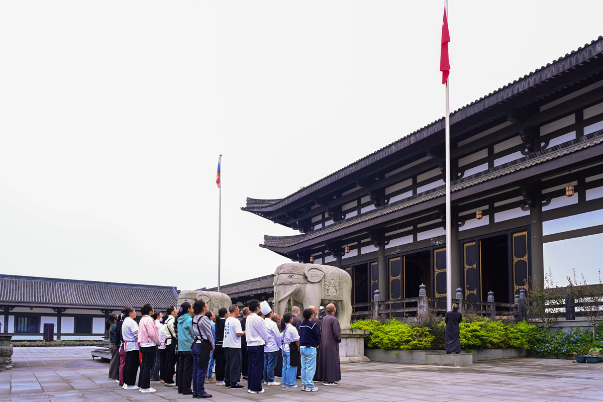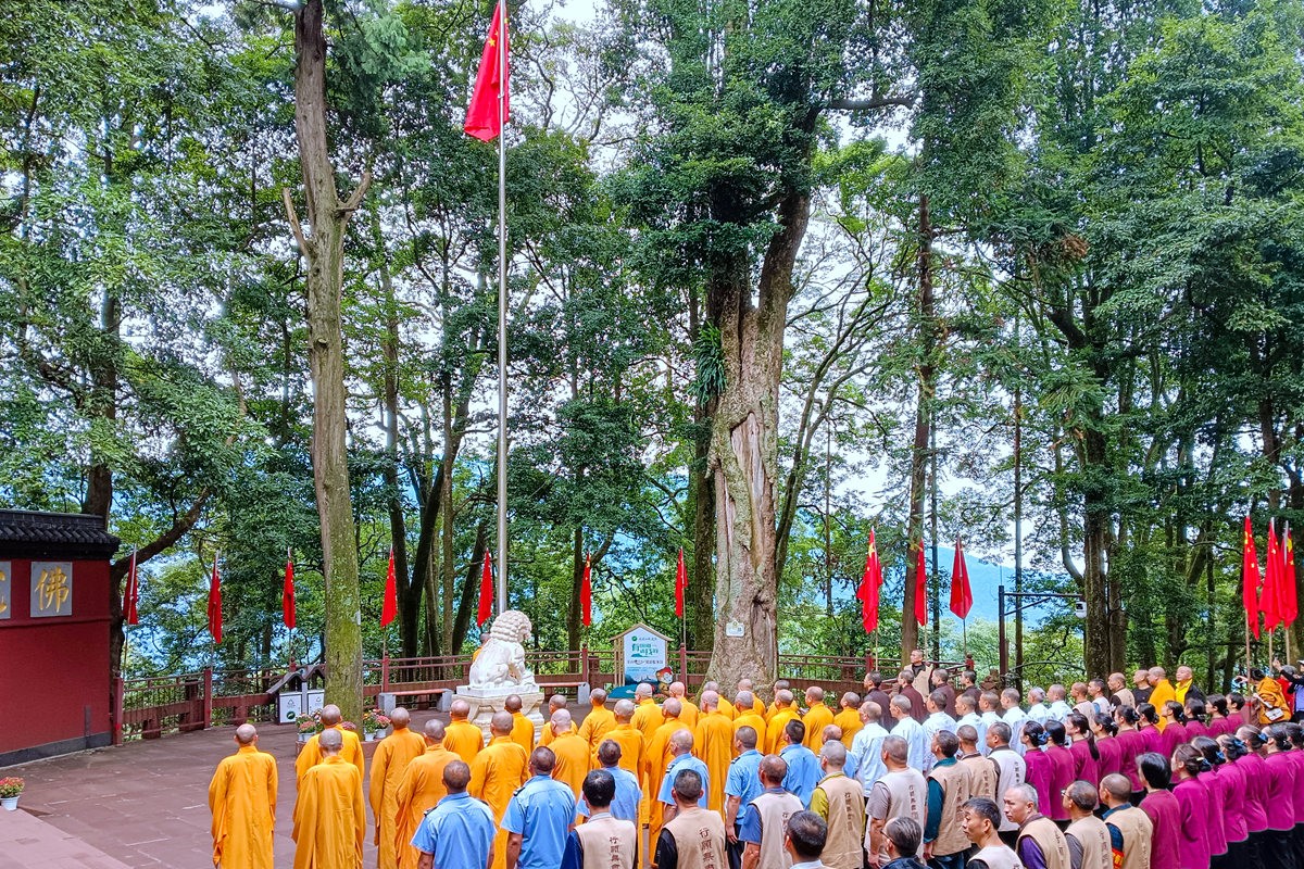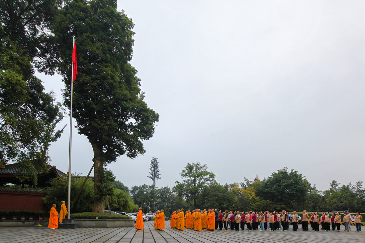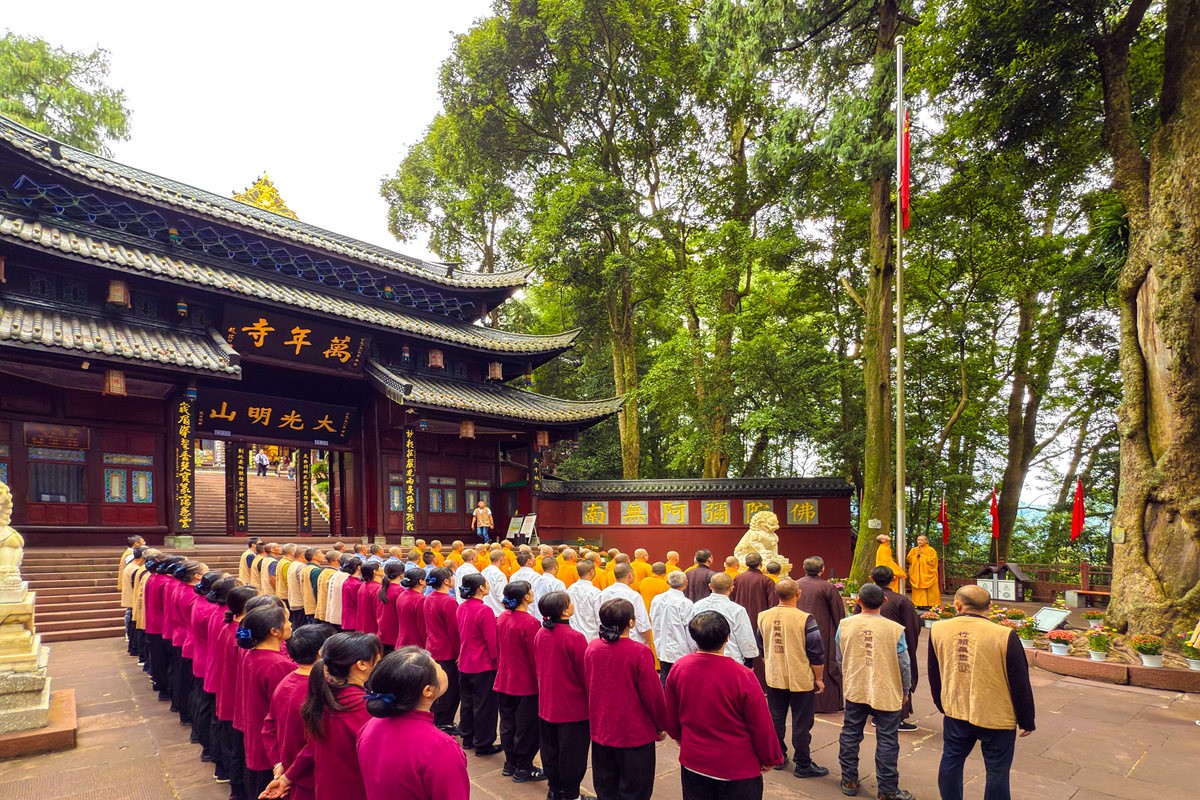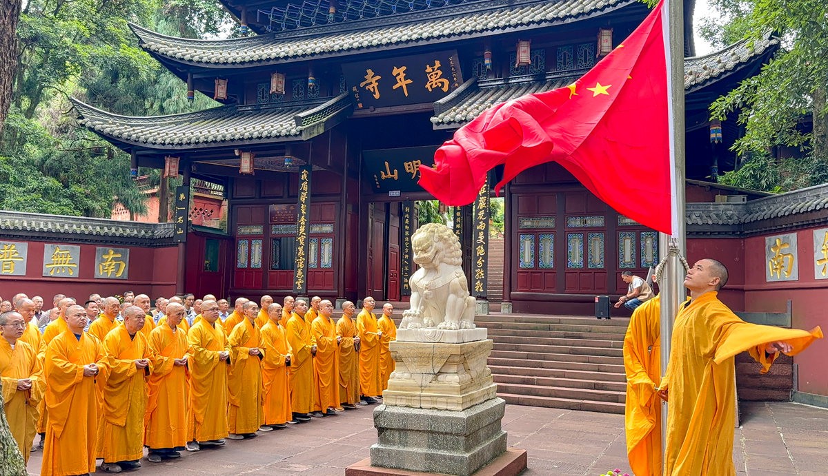 峨眉山各片区寺院同期也举行了升国旗仪式,各寺僧众员工及香客游人参加仪式。