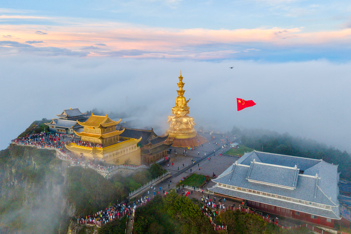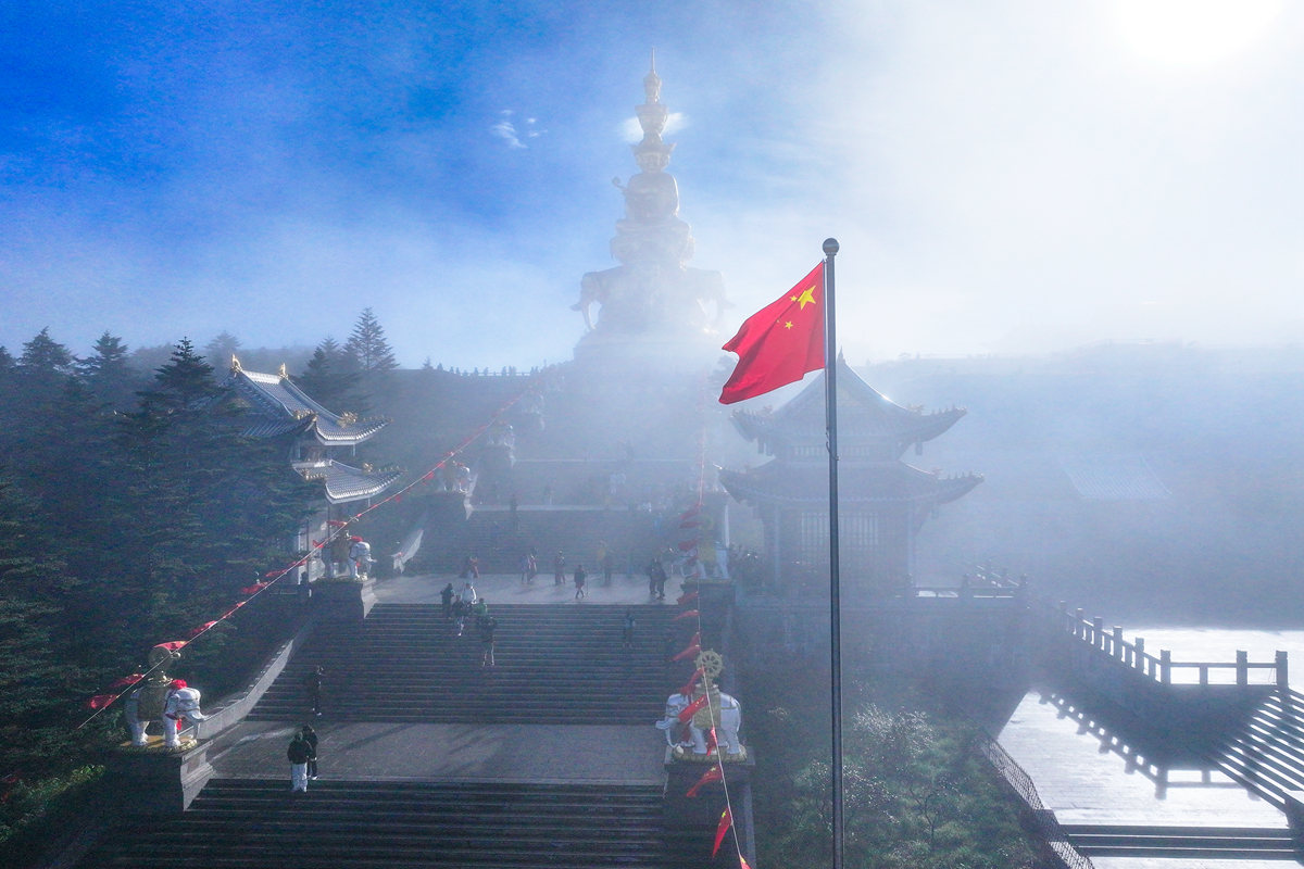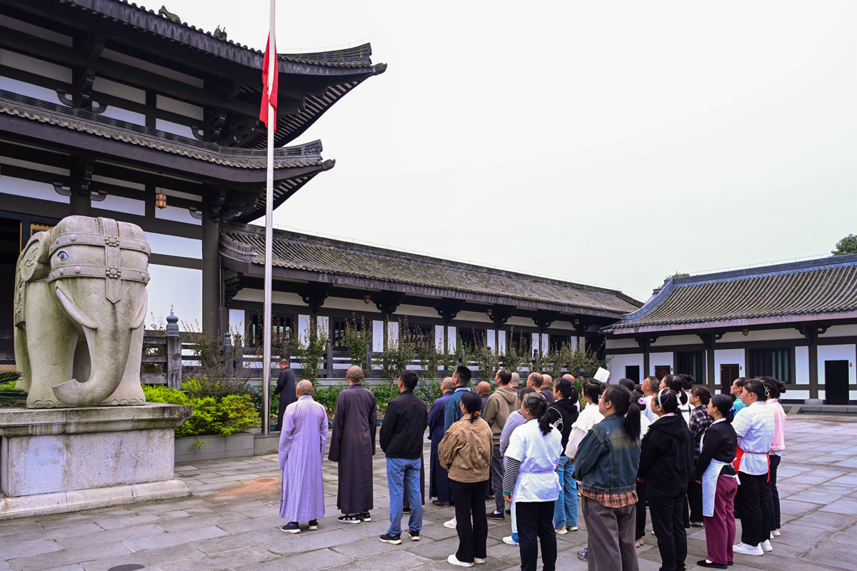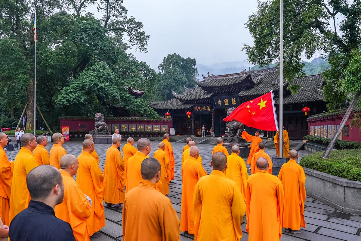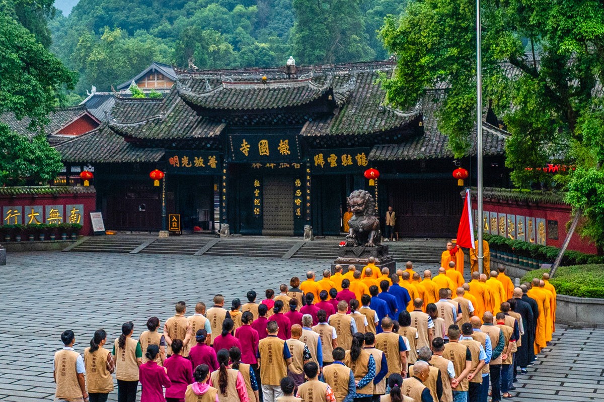 峨眉山各片区寺院同期也举行了升国旗仪式,各寺僧众员工及香客游人参加仪式。