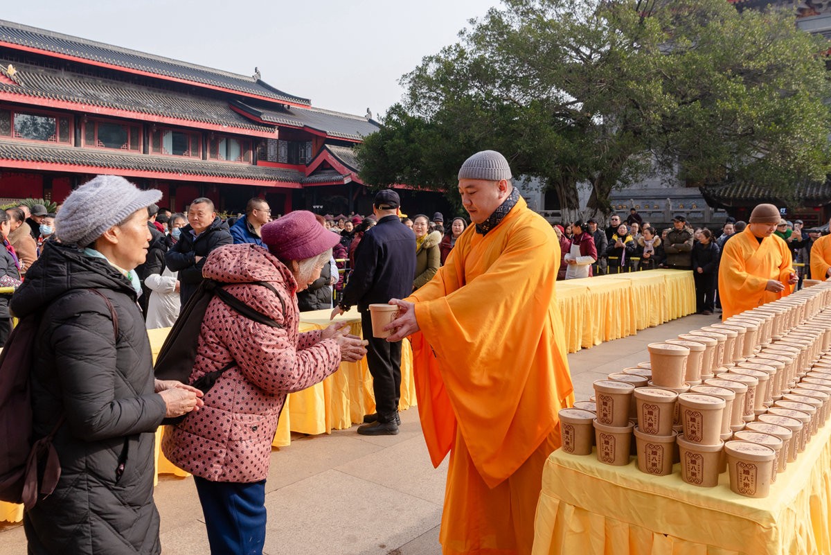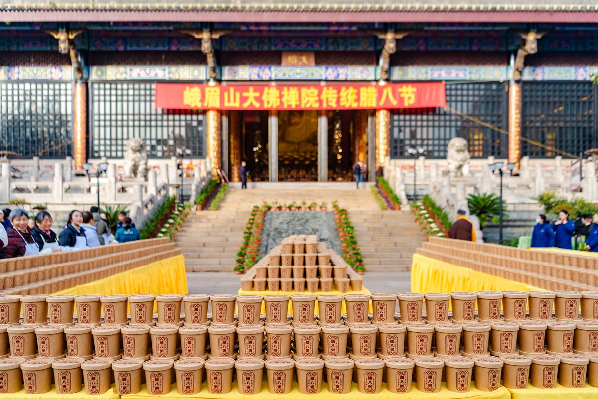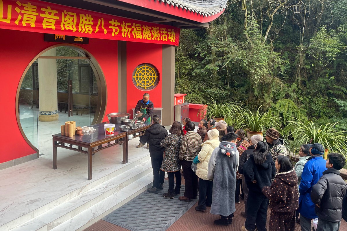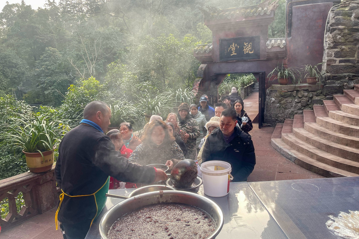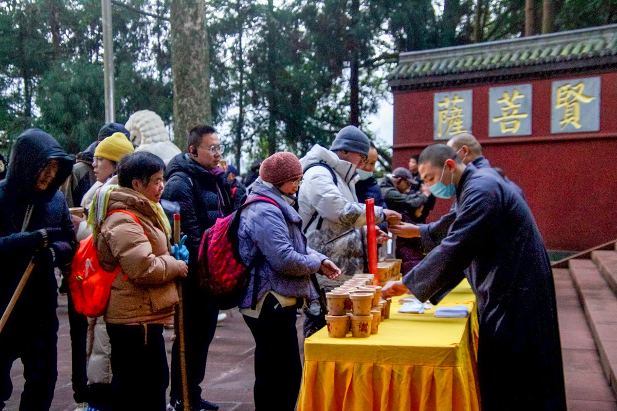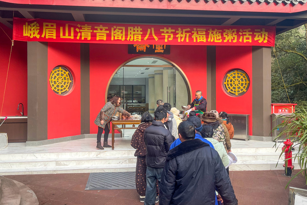 峨眉山佛教网消息:2026年元月26日(农历乙巳蛇年腊月初八),是中国传统的腊八节,也是释迦牟尼佛成道日,为弘扬中华优秀传统文化、感念佛陀恩德、践行普贤菩萨行愿精神、传递节日温暖,峨眉山全山各寺开展免费施粥送福活动,为信众游人送上节日祝福。在各寺院的施粥会上,信众、游人排队接受施粥,共沐佛光、同沾法喜。