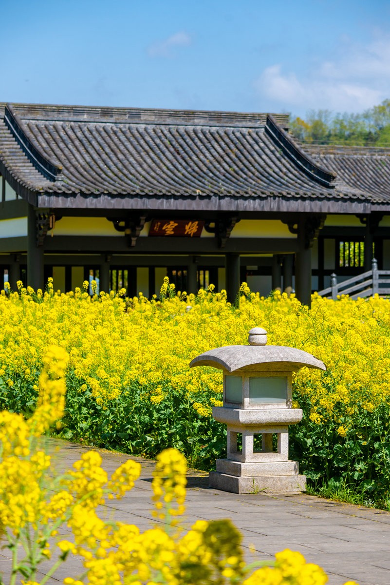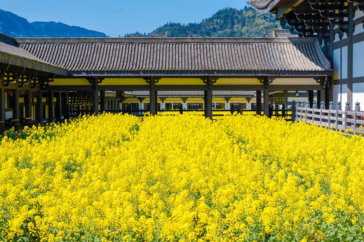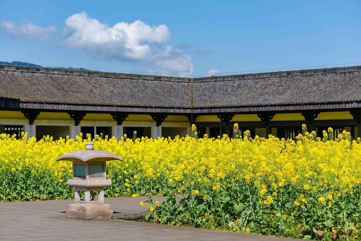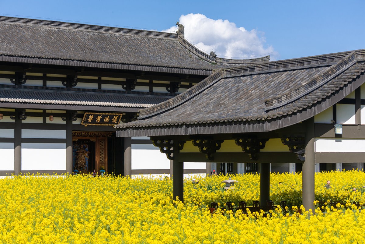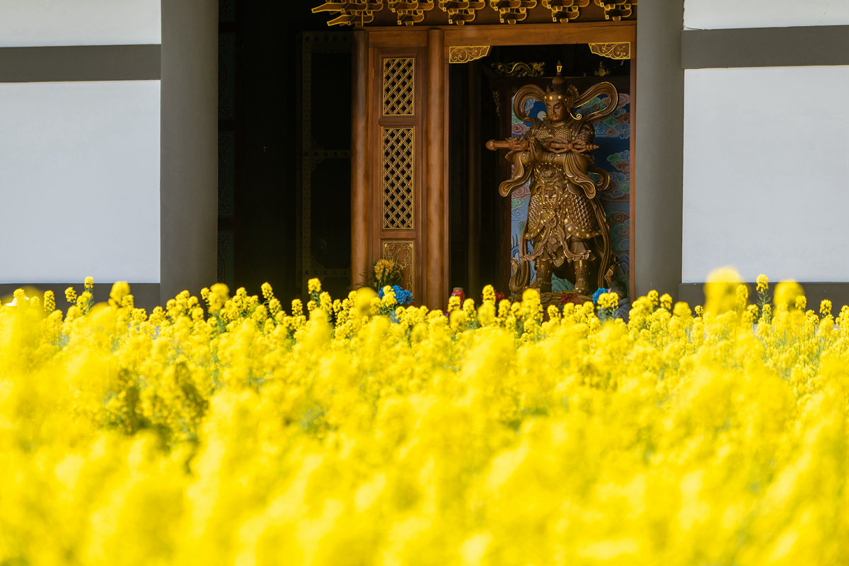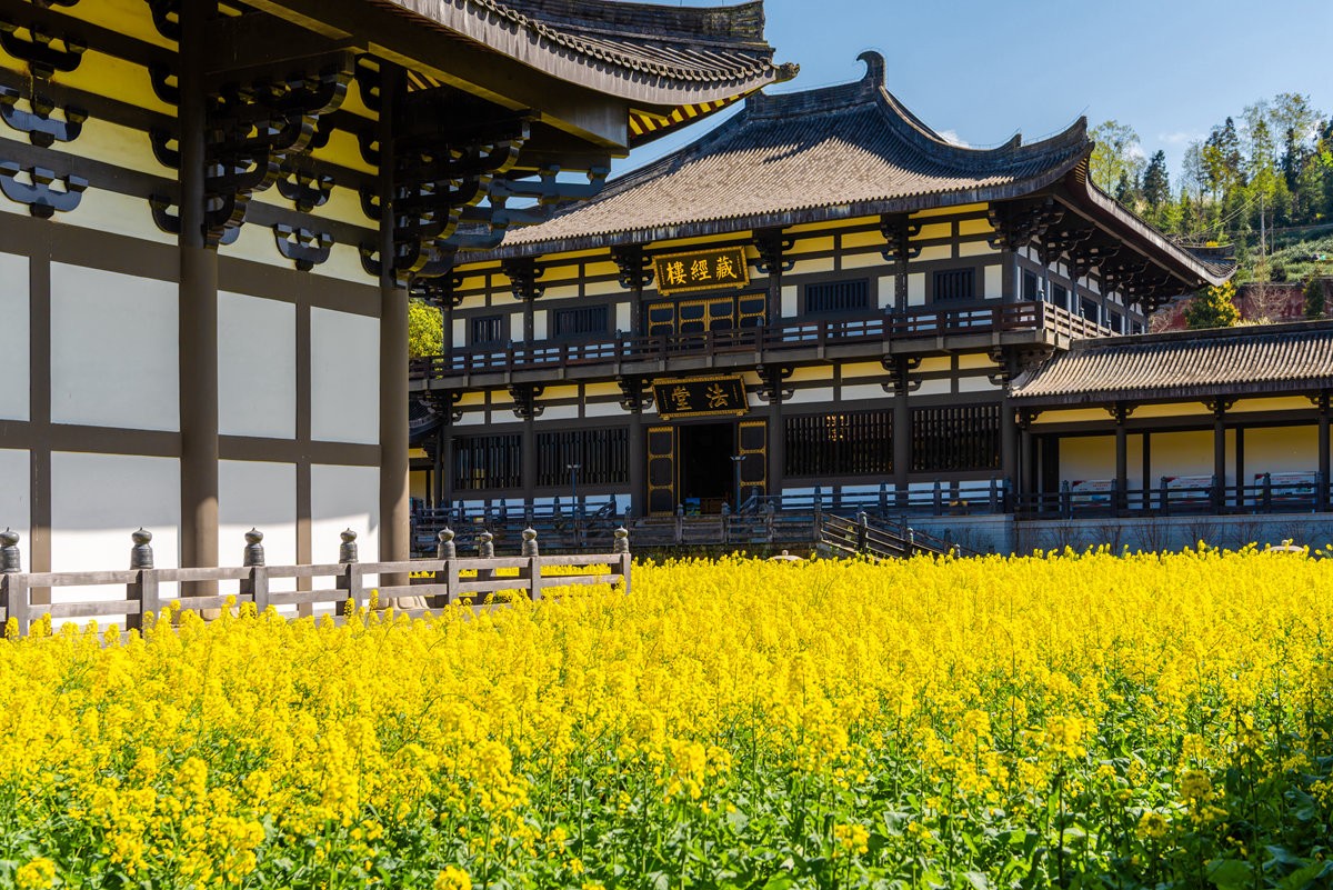 早春时节,巴蜀大地春意萌动,洪雅县柳江光明寺迎来绝美景致。寺内油菜花竞相绽放,满目金黄,丛间蝶舞蜜蜂忙,浓浓花香清新自由、沁人心脾。金色花海如锦绣,将佛殿映衬得金璧光辉、庄严神圣。
